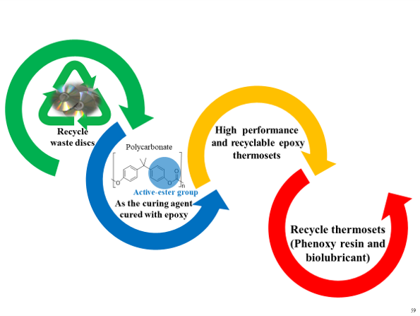 本實驗室利用廢棄光碟所製成之回收聚碳酸酯( Waste Polycarbonate, WPC ),作為活性酯型環氧樹脂硬化劑。且所製備出WPC-epoxy固化物表現出與市售PN/epoxy固化物系統具有相當之熱性質,對於回收PC而言具有100%原子使用效率。 且一般環氧樹脂固化後無法進行降解回收,易造成環境問題。而WPC-epoxy固化物之具有可降解官能基團,可解決因環 氧樹酯所造成之環境問題。且降解過後之產物二己基脲及苯氧樹脂具有可利用性,達到將廢棄物再利用之永續性目的。
